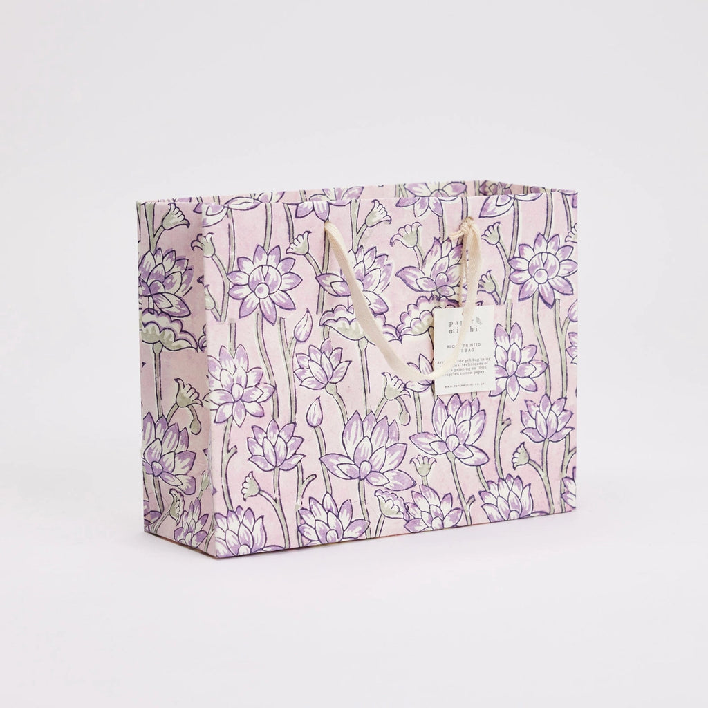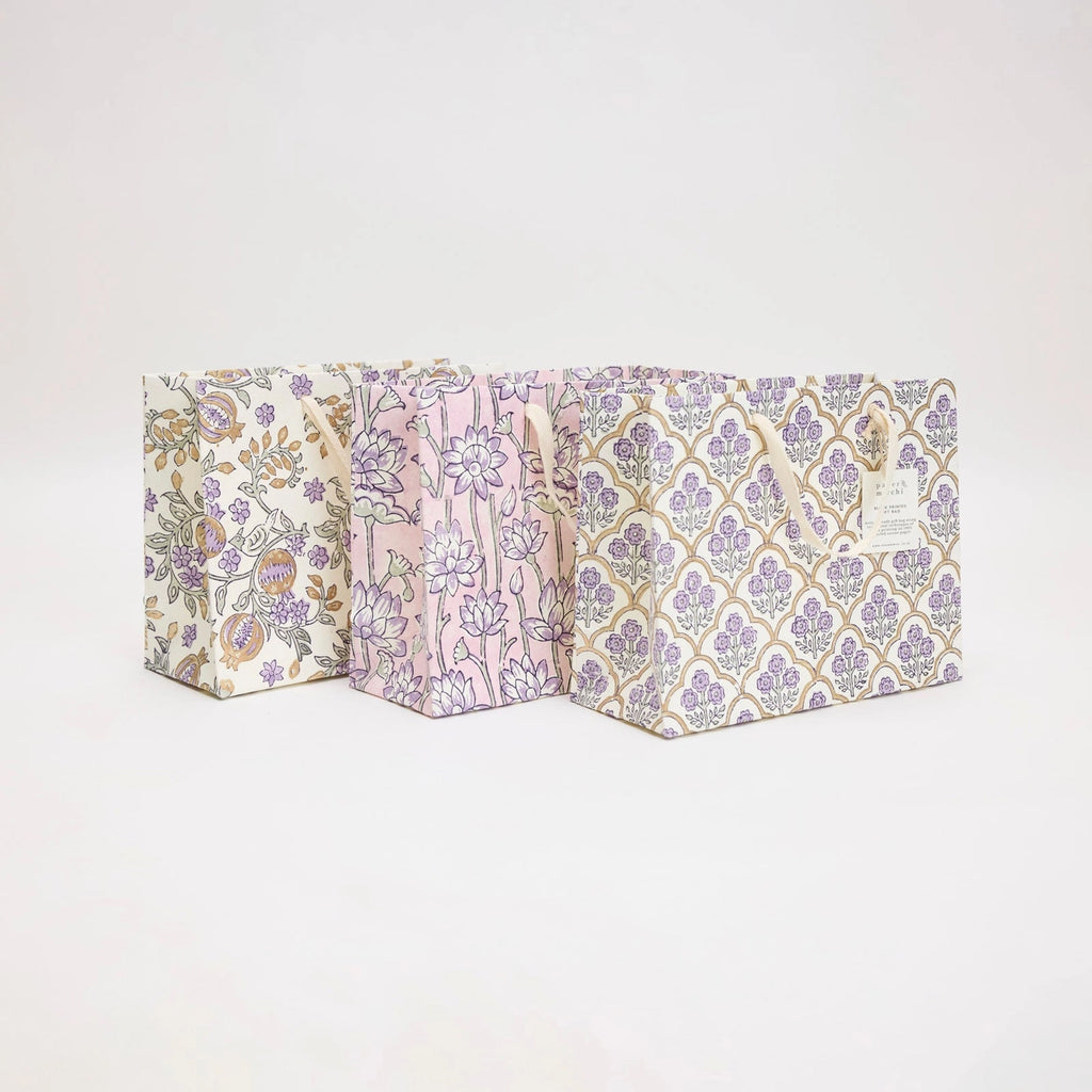 These hand marbled gift bags are made from a strong 250gsm recycled cotton card paper. The bags are hand marbled using traditional techniques, and are not digitally mass produced.