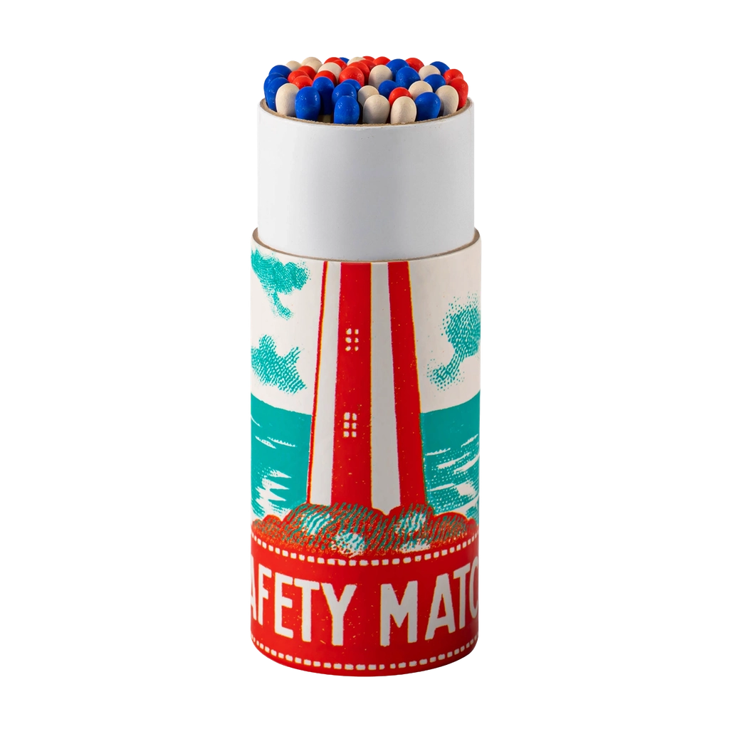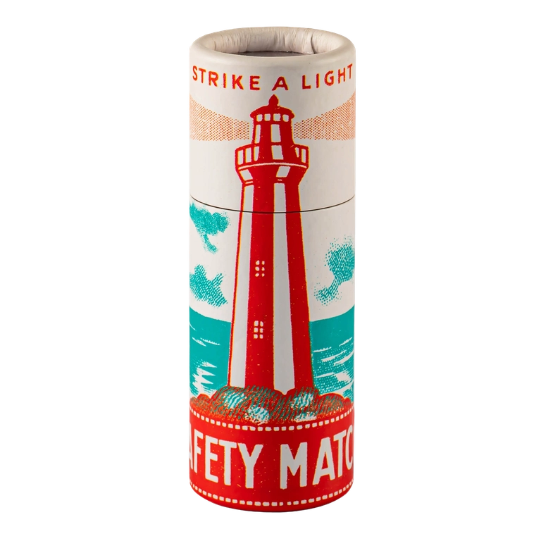 Small cylinder matches featuring a lighthouse on the bay with waves crashing at the base.