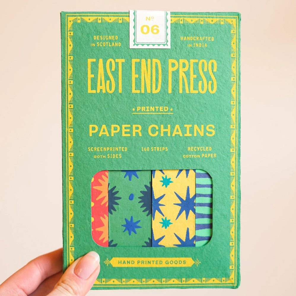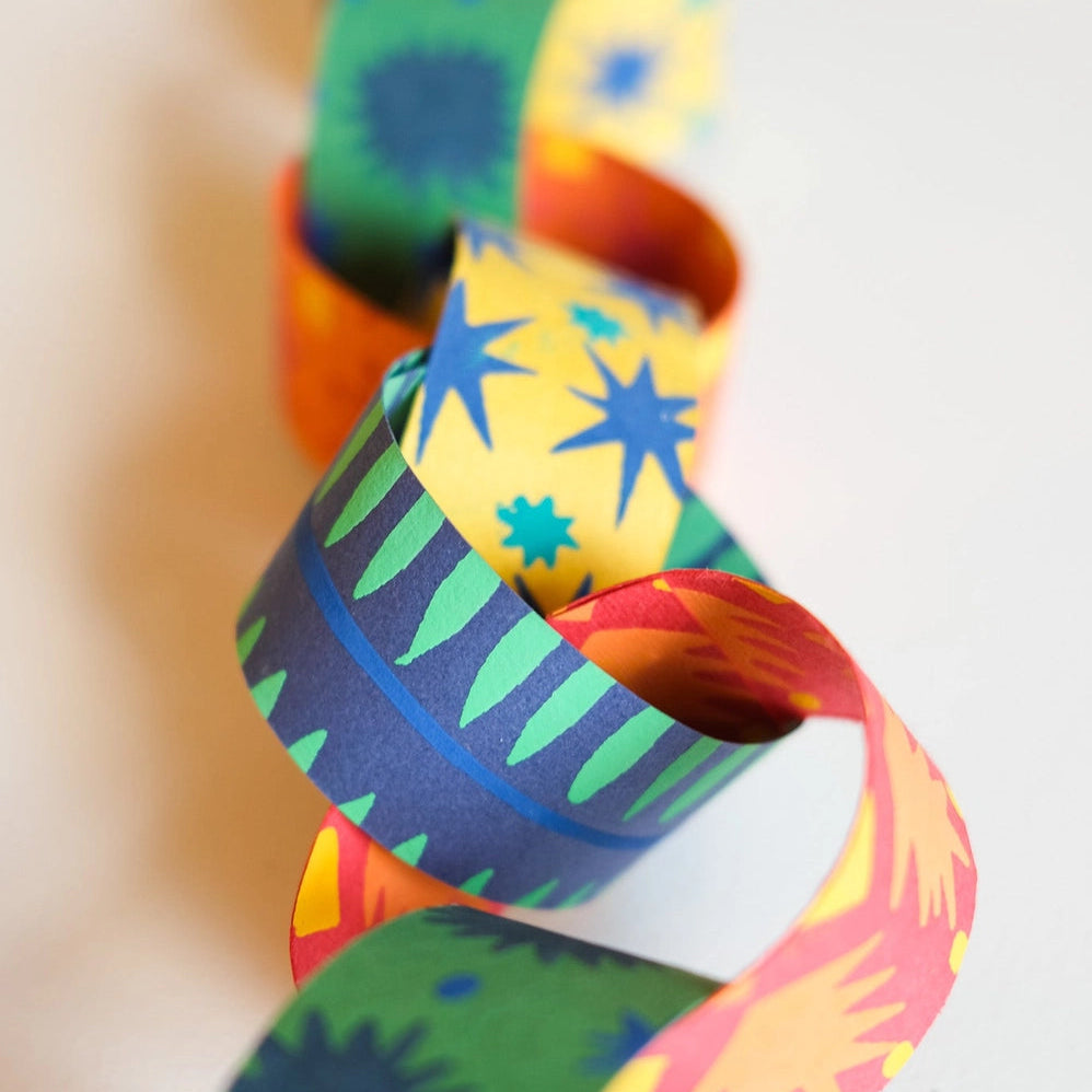 This paper chain kits contains 160 strips of recycled, patterned colourful strips which, when assembled, create ten metres of beautiful paper chains. Simply use glue or staple each loop to the next to create a classic party decoration. The paper is printed by hand on both sides so your paper chains always look great! - Set of 160 double-sided sheets of assorted patterned strips - Screen printed on both sides by hand talented artisans in Jaipur - Sustainably made from recycled materials