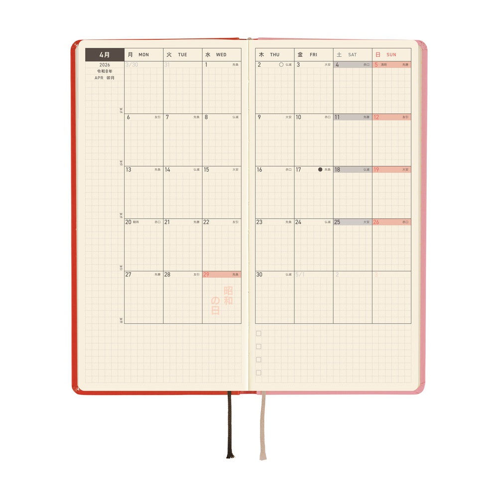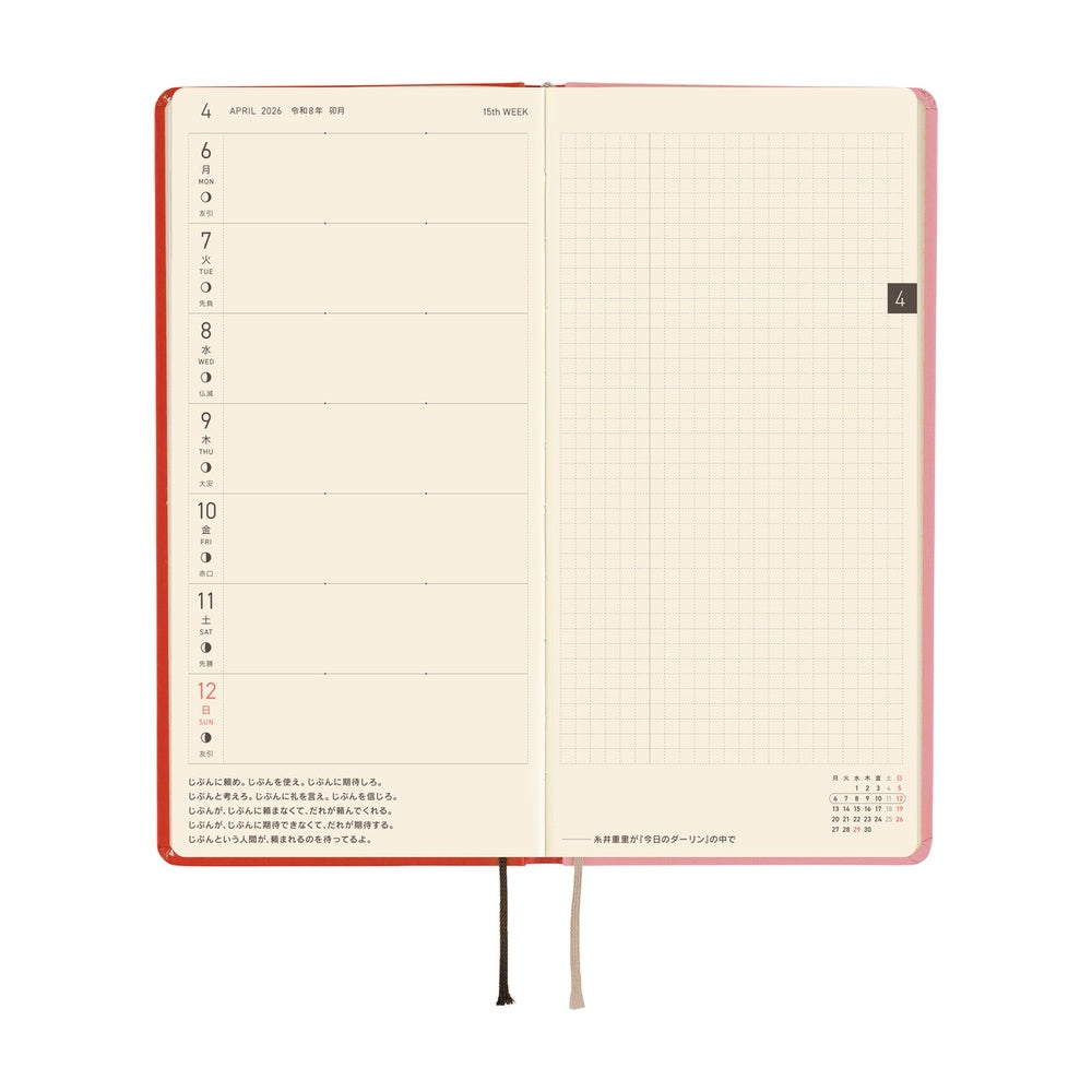 The cover features a bold layout of fresh, vibrant flowers painted in acrylic. The delicate yet distinct brush strokes of the painting, as well as the depth of the colors express the inherent vitality of plants. To make the beauty of the flowers stand out, the cover has a simple design without the year printed onto it. A Weeks that lets you experience the feeling of carrying a bunch of flowers with you anywhere you go.