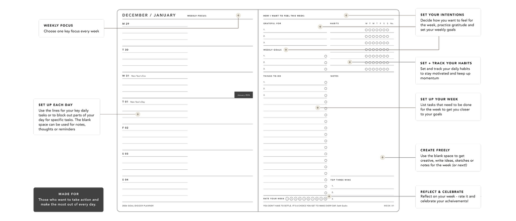 The 2026 Goal Digger planner is a comprehensive tool designed to help you define clear objectives and maintain focus throughout the year to maximize your productivity. Each week is formatted across two pages: your weekly schedule is on the left, while the right side includes sections for your priorities, goals, habits, and gratitude. Additional spaces allow for to-do lists, notes or visuals, plus a habit tracker and a wins log. At week's end, you can evaluate your performance on a scale of 1 to 10. Monthly planning segments assist in setting purposeful, realistic targets, complemented by monthly assessments to monitor progress and keep motivation high. Presented in an elegant gift box, this planner supports organization, accountability, and sustained inspiration.