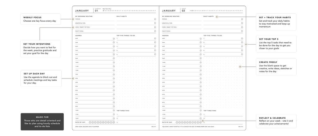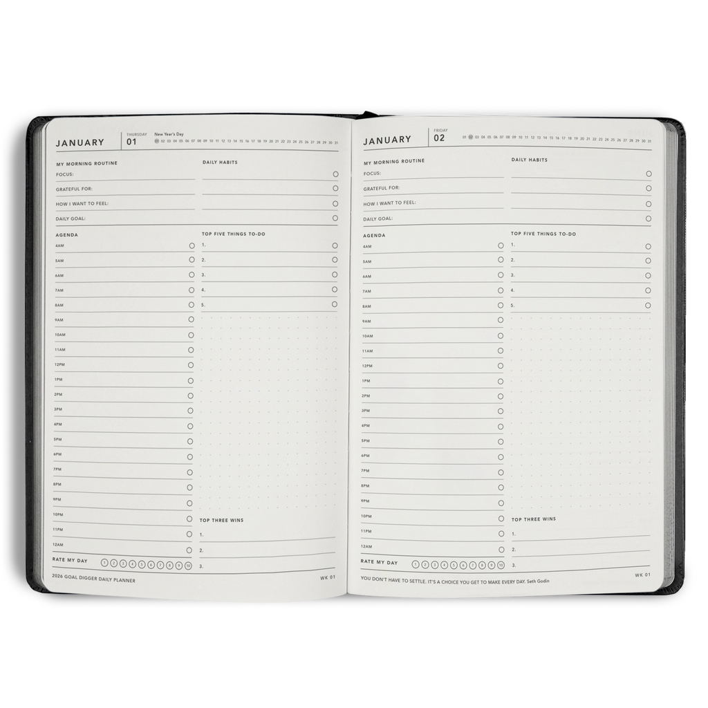 The DAILY Goal Digger planner offers a dedicated page for each day, allowing you to plan and act with precision daily. Serving as a personal coach, it helps you maintain focus on your objectives, supports the formation of positive habits, and motivates you to take decisive steps toward your aspirations. Clarify your purpose and establish a strong foundation for success by setting purposeful goals aligned with your values. Stay organized and motivated each day while making meaningful strides toward your ambitions and dreaming boldly.