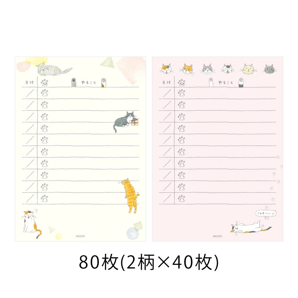 Stay organised and motivated with the MIDORI To-do List Cat Memo Pad, a charming and practical tool for managing your tasks. Perfect for work, housework, shopping, studying, or preparing for a trip, this memo pad makes task management both easy and enjoyable. The glued-top design allows for effortless tearing of sheets, while two adorable patterns filled with cute cat illustrations will brighten your day.