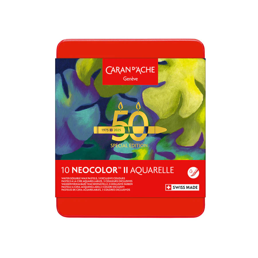 Celebrating five decades of artistic excellence, Caran d'Ache's Neocolor II Aquarelle Wax Pastels have remained the preferred choice for professional artists and creatives worldwide. This Pop Special Edition tin contains ten carefully curated colours, including three exclusive shades from the brand's expanded 50th anniversary palette. Renowned for their exceptional pigment intensity and remarkable versatility—blendable with water for watercolour effects or applied dry for bold, vibrant coverage—these aquarelle pastels deliver consistent, professional-grade results. The specially designed tin packaging reflects the milestone celebration, making this a distinguished addition to any artist's collection.