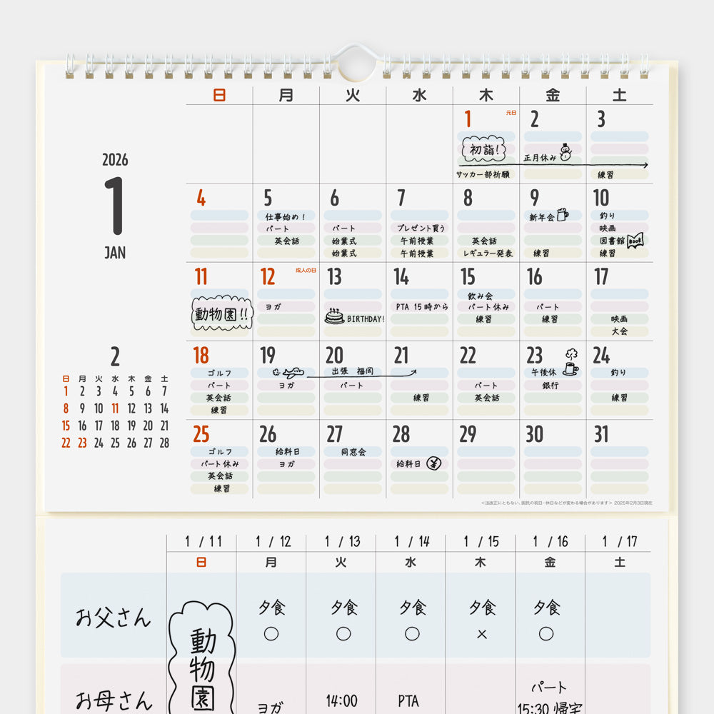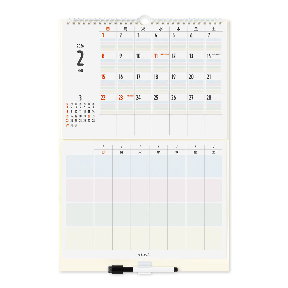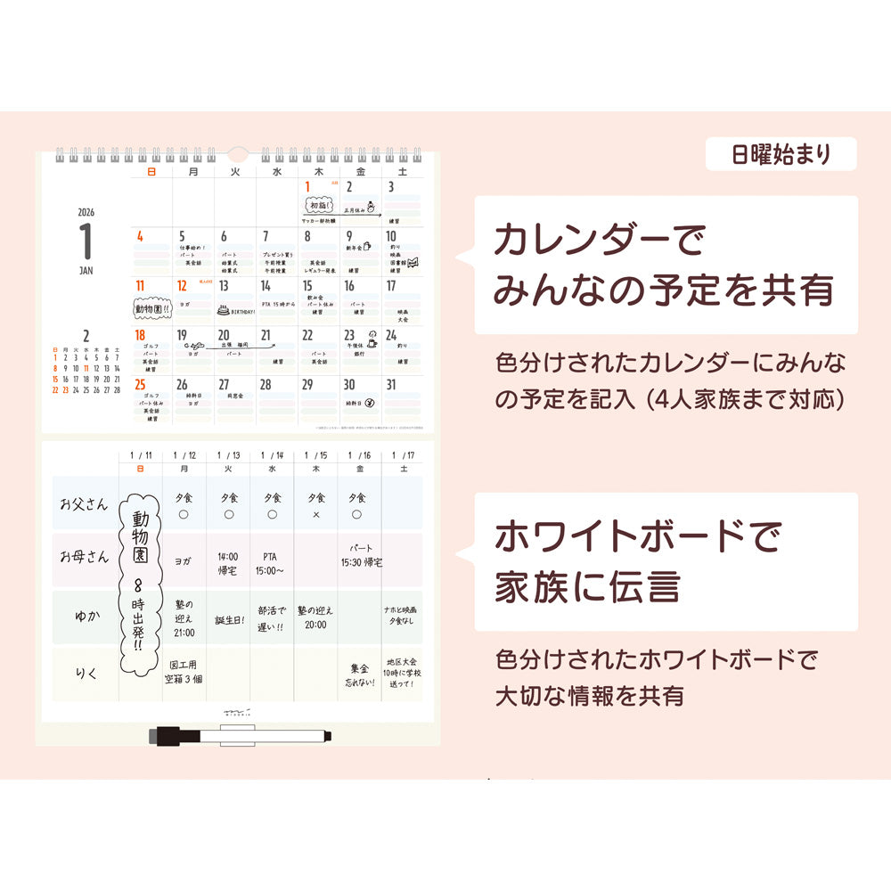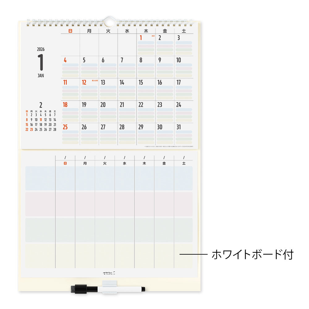 The Midori 2026 Family Wall Calendar with Whiteboard is designed for seamless household scheduling. It integrates a paper monthly calendar with a weekly erasable whiteboard, dividing each day into four color-coded sections for easy tracking of up to four family members. The whiteboard allows quick updates and reminders, while the clear Universal Design Font ensures readability for all ages. This calendar provides an efficient, visual way to organize family plans and enhance daily communication.