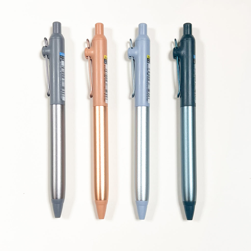 The Flow model features a softly colored ABS plastic upper barrel, with a long matching metal grip section for two-tone design that adds a touch of elegance to your desk. On the back end, a spring-loaded wire clip in the same shade opens wide for attaching the pen to a notebook or textbook.