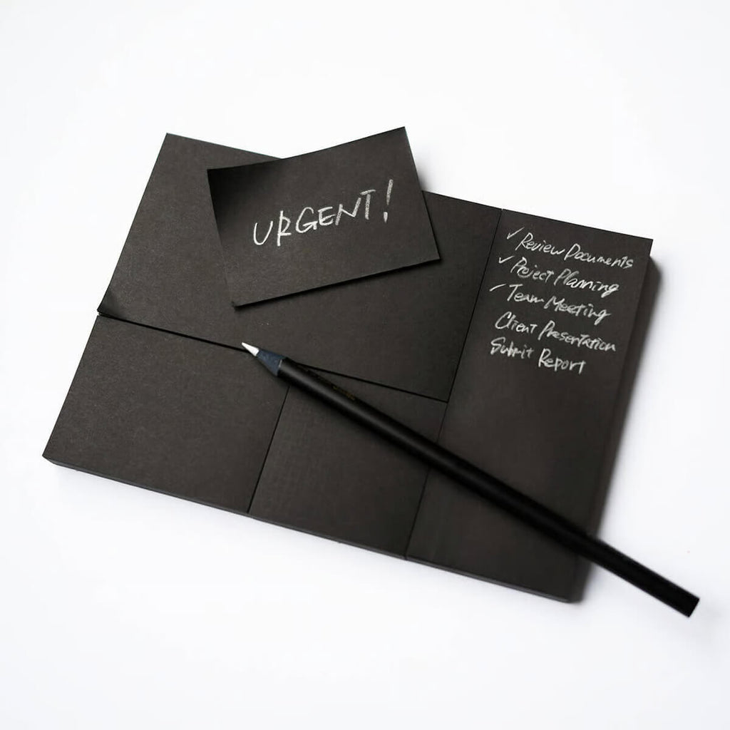 Craft Design Technology reimagines the humble sticky note with striking black paper that transforms your writing into visual art. Vibrant white ink, metallics, and colored pencils create stunning contrast against the jet-black surface, ensuring your ideas command attention. Available in B6 and B7 sizes, these notes feature a subtle black-green grid and checklist lines (L size), embodying CDT's minimalist aesthetic. The tactile quality of premium black paper elevates the note-taking experience, while the versatile format suits everything from task management to creative brainstorming. Whether capturing fleeting thoughts or organizing complex projects, these sticky notes combine functional design with contemporary sophistication, turning everyday notation into an intentional creative practice.