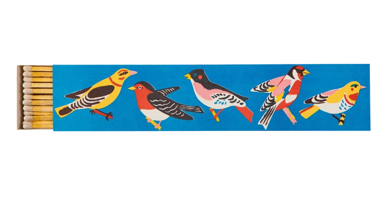 Long matchbox featuring five vibrant colours of birds on a bright blue background.