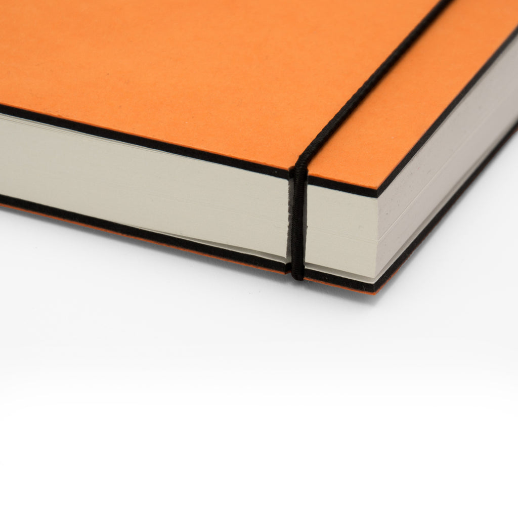 Hand-stitched sketchbook featuring premium 160gsm pure white paper with perforated sheets for easy removal. The cover combines specially coloured cellulose cardboard laminated onto sturdy black stock, secured with an elastic rubber band closure.