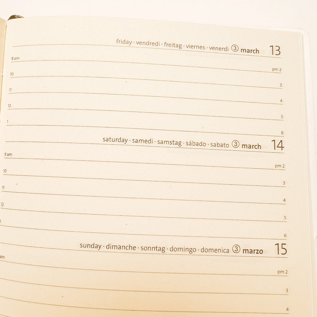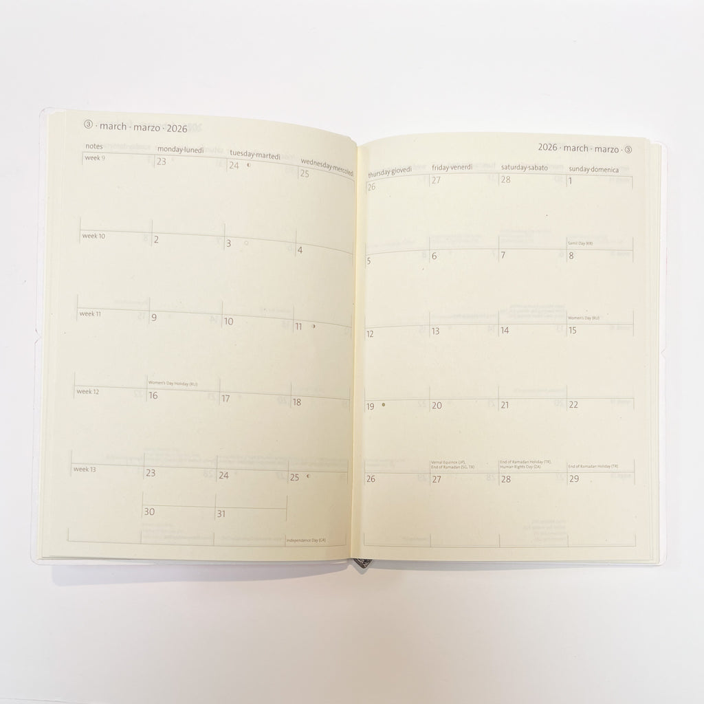The Ciak 2026 Weekly Diary in B6 size offers a practical week-at-a-glance layout across two pages, supporting efficient planning. Its vegan-friendly faux leather cover paired with ivory recycled paper, suitable for fountain pens, ensures durability and an eco-conscious choice. Measuring 120mm x 170mm, it features a horizontal elastic closure and a ribbon bookmark for convenient use. With 160 meticulously handmade pages produced in Italy, this diary balances refined craftsmanship with daily functionality throughout the year.