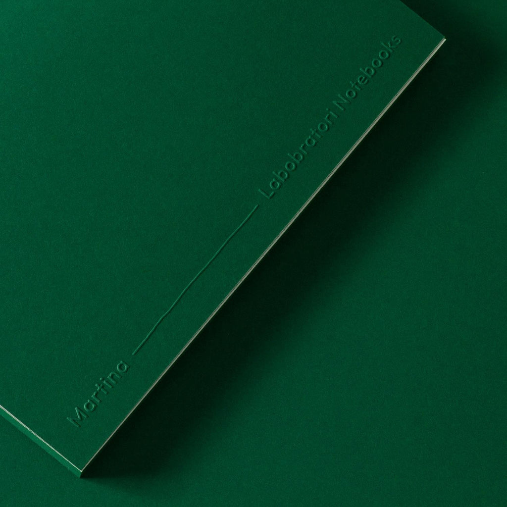 It is part of the MARTINA collection, a homage to Agnes Martin's minimalist vision and the Martini bookbinding tradition. The tactile relief invites the hand; visible thread stitching signals honest construction; FSC-certified Munken Lynx paper (100 g/m²) rewards the pen.