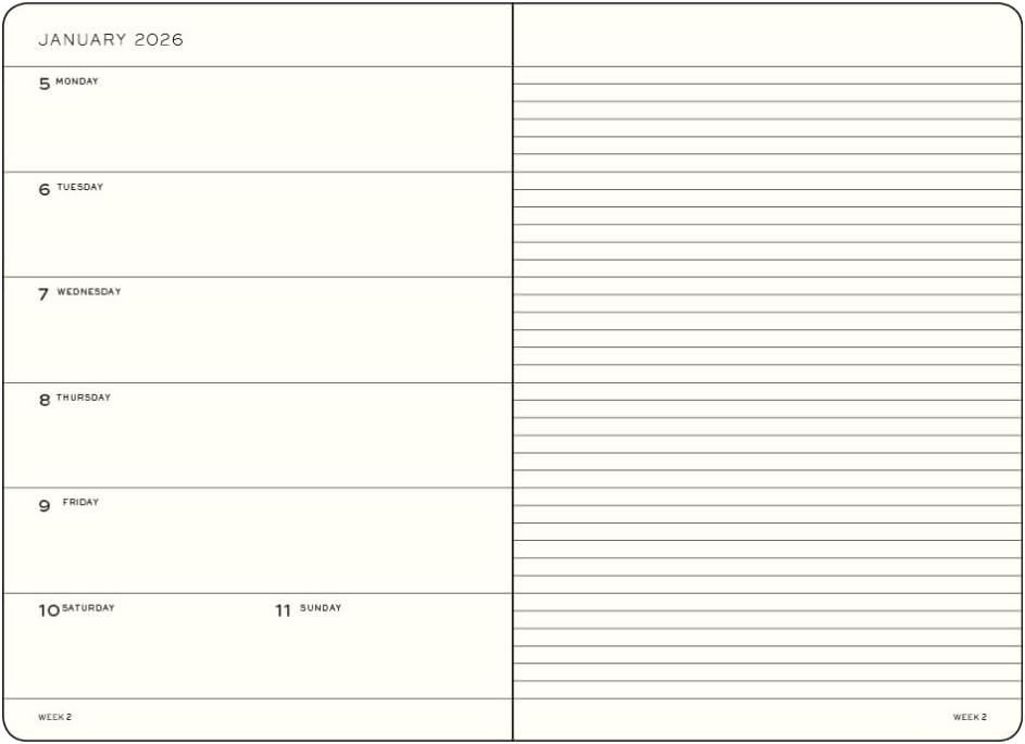 • January 2026 - December 2026• 7 days to a page• Each week, there is a lined page for notes• 144 pages• 3-year overview• Gusseted pocket• 2 Page markers• Elastic enclosure band• Thread-bound book opens flat• Sticker set for labelling and archiving