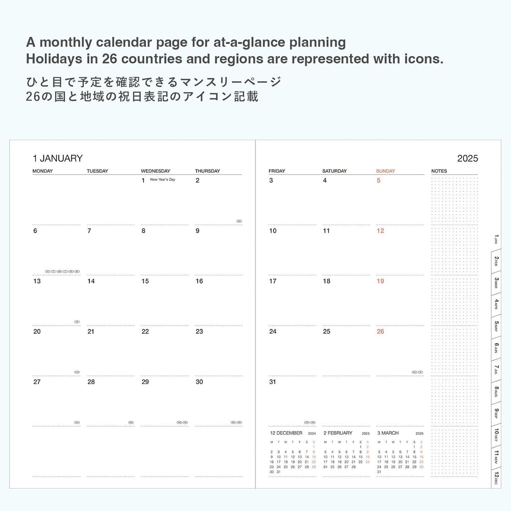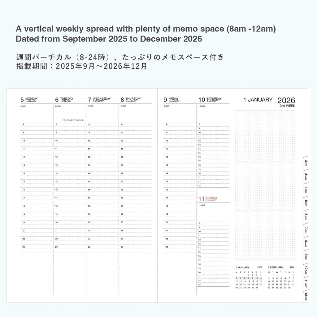 Mark's 2026 diaries run from September 2025 to December 2026 and feature a vertical weekly layout, with a 16-hour schedule from 8 am - 11 pm, perfect for planning your days in 30 min blocks. It has monthly tabs at the side so you can easily find the correct place and monthly overviews at the start of each month for all your planning needs.