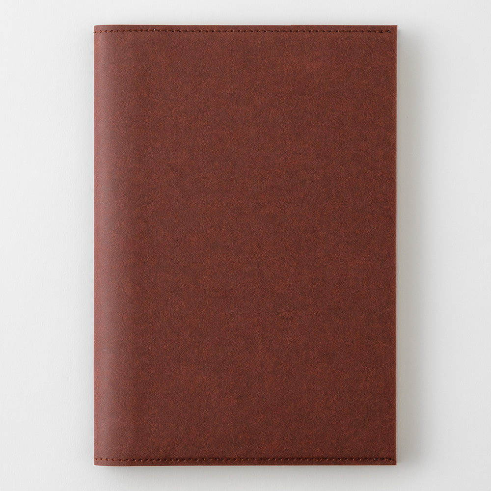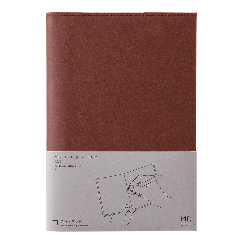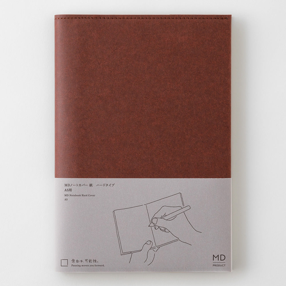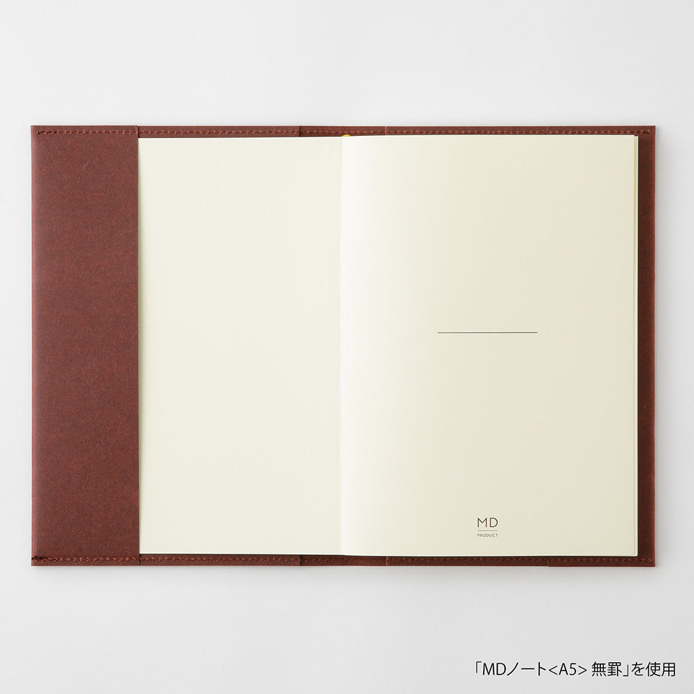 This hard cover is made of firm, sturdy paper. It features a smooth texture and a natural hue reminiscent of vegetable-tanned leather. It provides a stable backing whether you open the MD Notebook on your lap or while standing, allowing you to engage with writing anytime, anywhere. It gives the notebook the solid, dignified presence of a hardcover book.