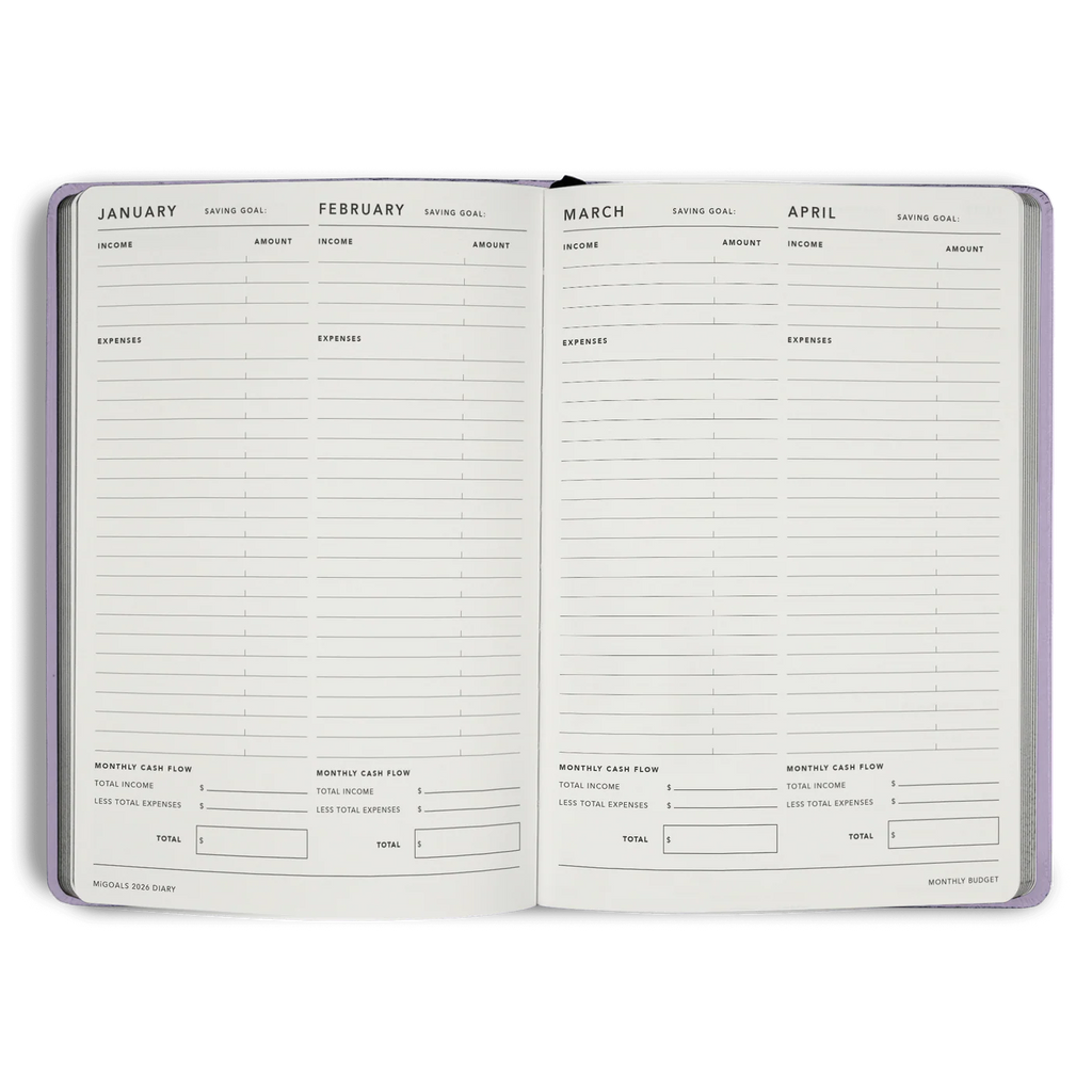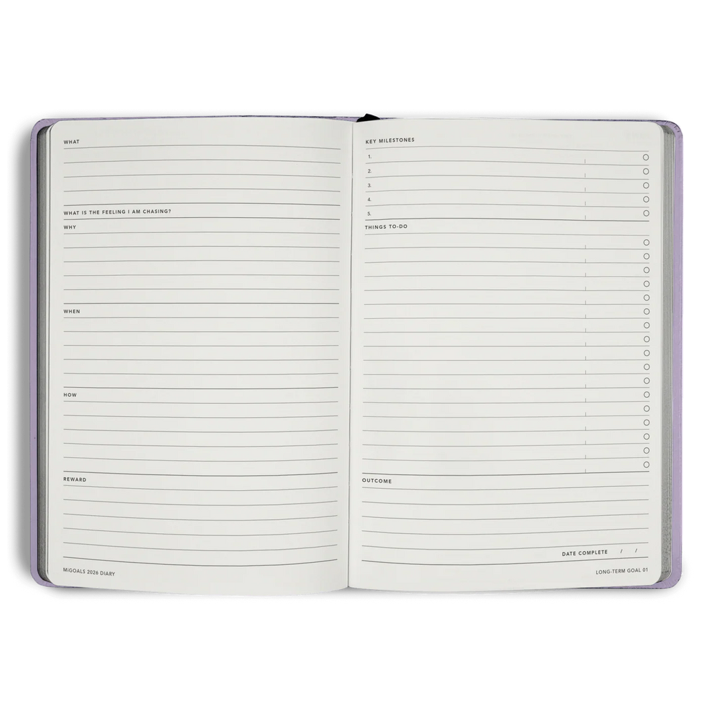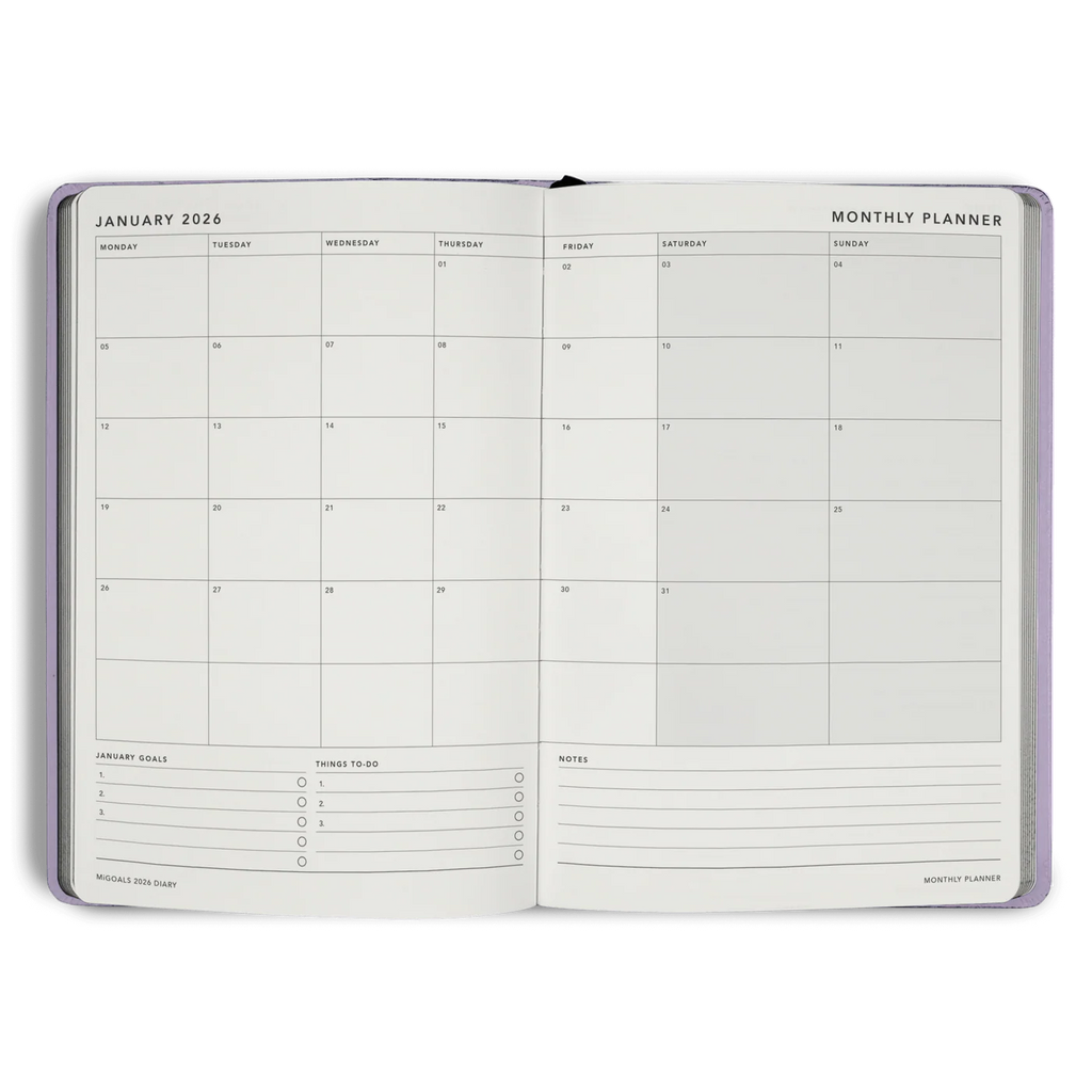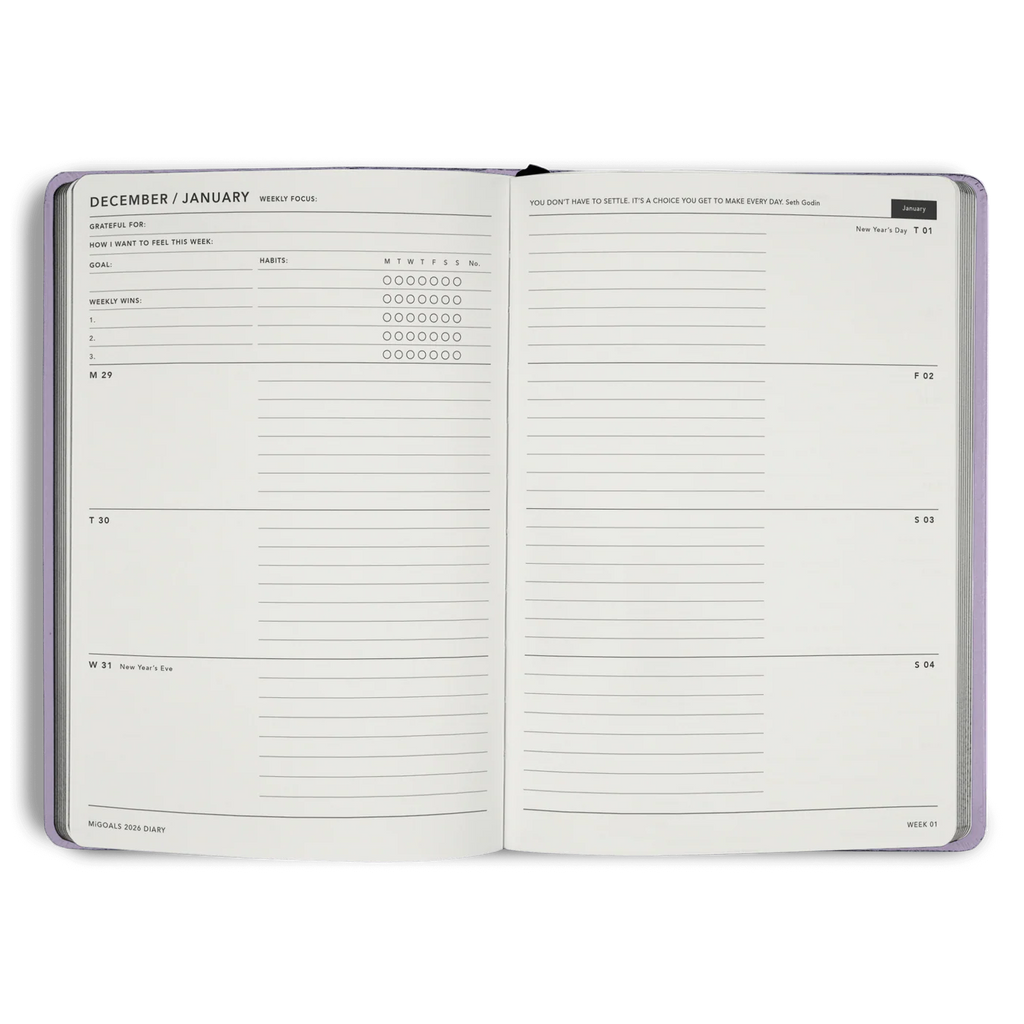 The MiGoals 2026 A5 Weekly Spread Diary offers a clean, minimal layout with a full week on one spread, ideal for breaking big goals into manageable steps. Designed for clarity and balance, it helps you plan projects, build lasting habits, and track progress without daily overwhelm. This diary keeps your big-picture vision visible while allowing space to organise, reflect, reset, and celebrate small wins, empowering consistent forward movement throughout 2026.