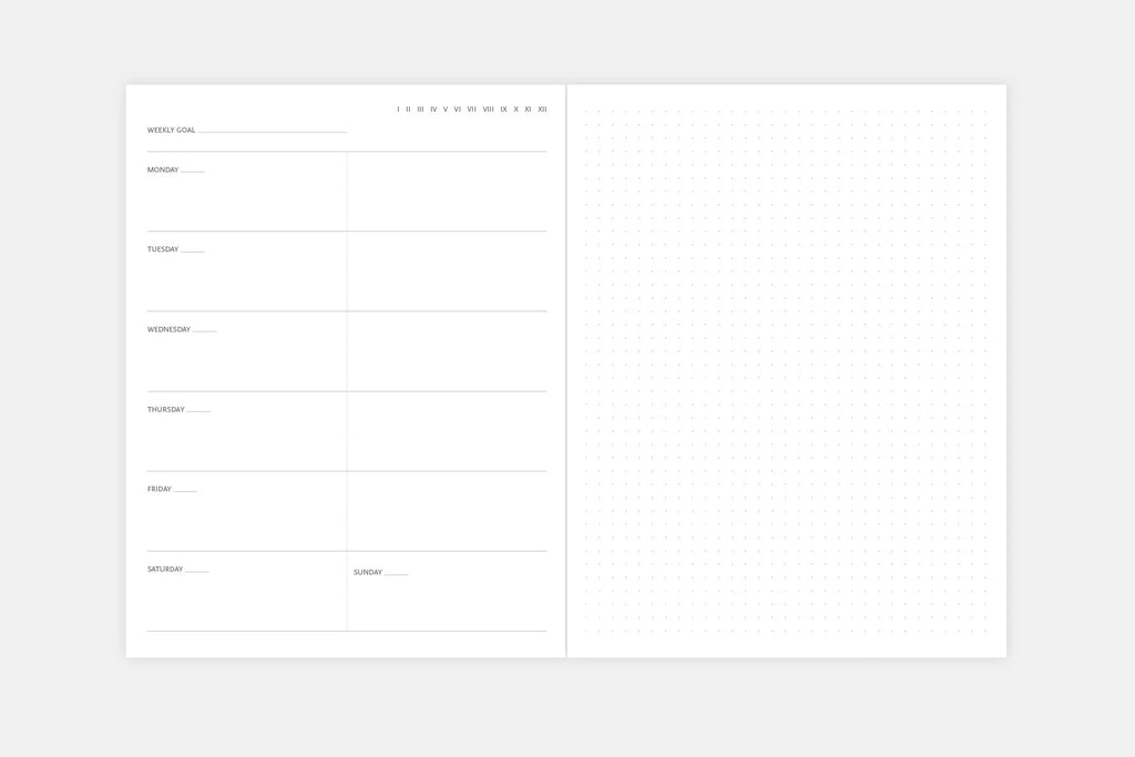 Interior: 200 pagesPlanner for 54 weeks + 80 dotted pages for notes