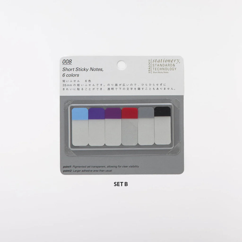 The Stalogy 008 Short Sticky Notes are designed for precise annotations in books and journals. Crafted from tear-resistant plastic, these notes feature a translucent adhesive section that ensures text remains visible underneath. Each pack includes 60 notes across six pigmented yet transparent colors, with a larger adhesive area for enhanced durability. Measuring 15mm by 35mm, these index tabs provide reliable, neat marking with two color palettes to choose from. Manufactured in Japan, they combine functionality and quality for expert use.
