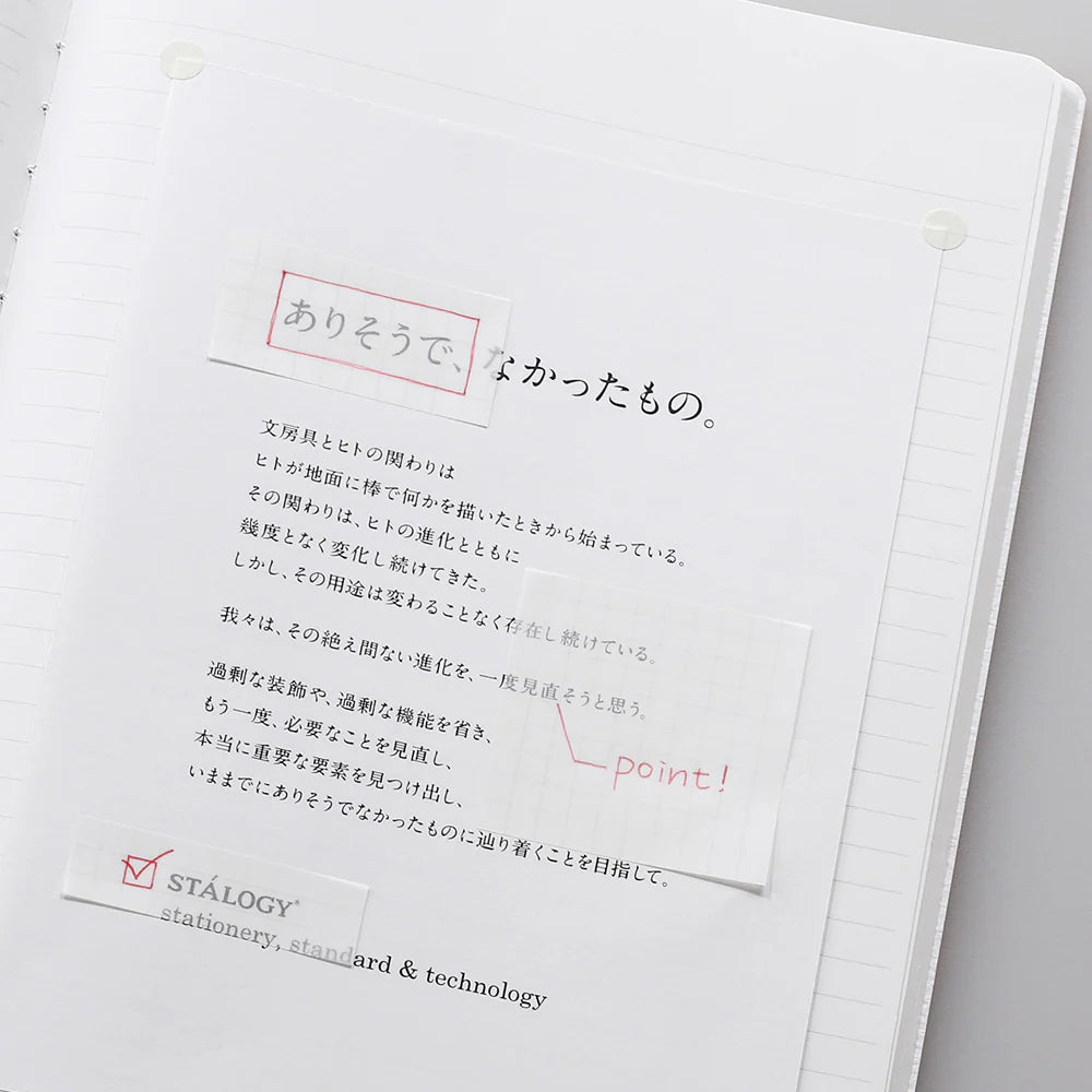 Stalogy 010 Translucent Sticky Notes offer a unique combination of transparency and durability, allowing you to overlay them on notebooks, grid pads, books, or maps without obscuring underlying content. Crafted from resilient polypropylene film, these notes withstand writing with pencils, permanent, or water-based markers and resist tearing. Each pack includes 50 stickers measuring 50 mm × 50 mm, designed to peel off cleanly without leaving residue. Proudly made in Japan, they provide a practical and expert solution for seamless note-taking across various surfaces.