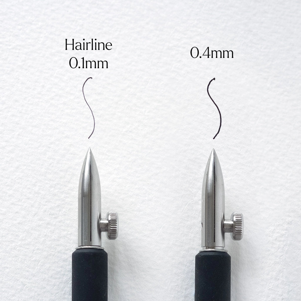 An experimental calligraphy nib. This nib is a delight for illustrators and calligraphers, offering the ability to adjust the nib for a wide range of stunning line variations. With a simple twist of the thumb screw, you can produce broader or finer lines, or change the nib's angle to the page to create rich, thick strokes.