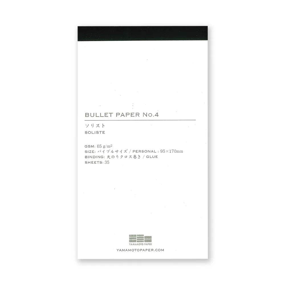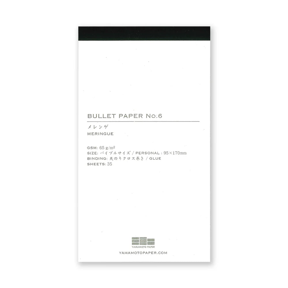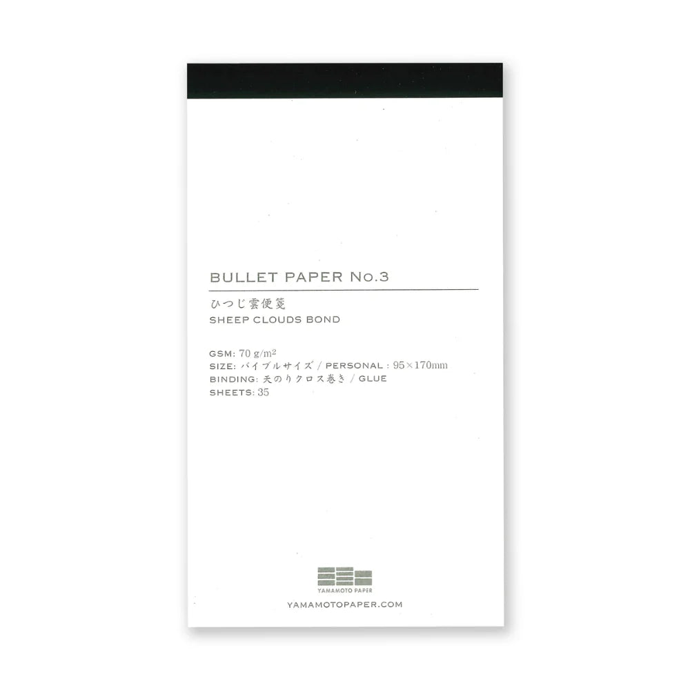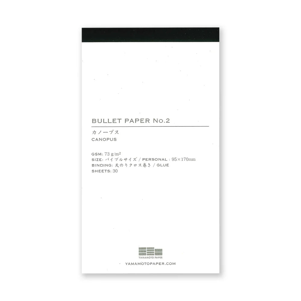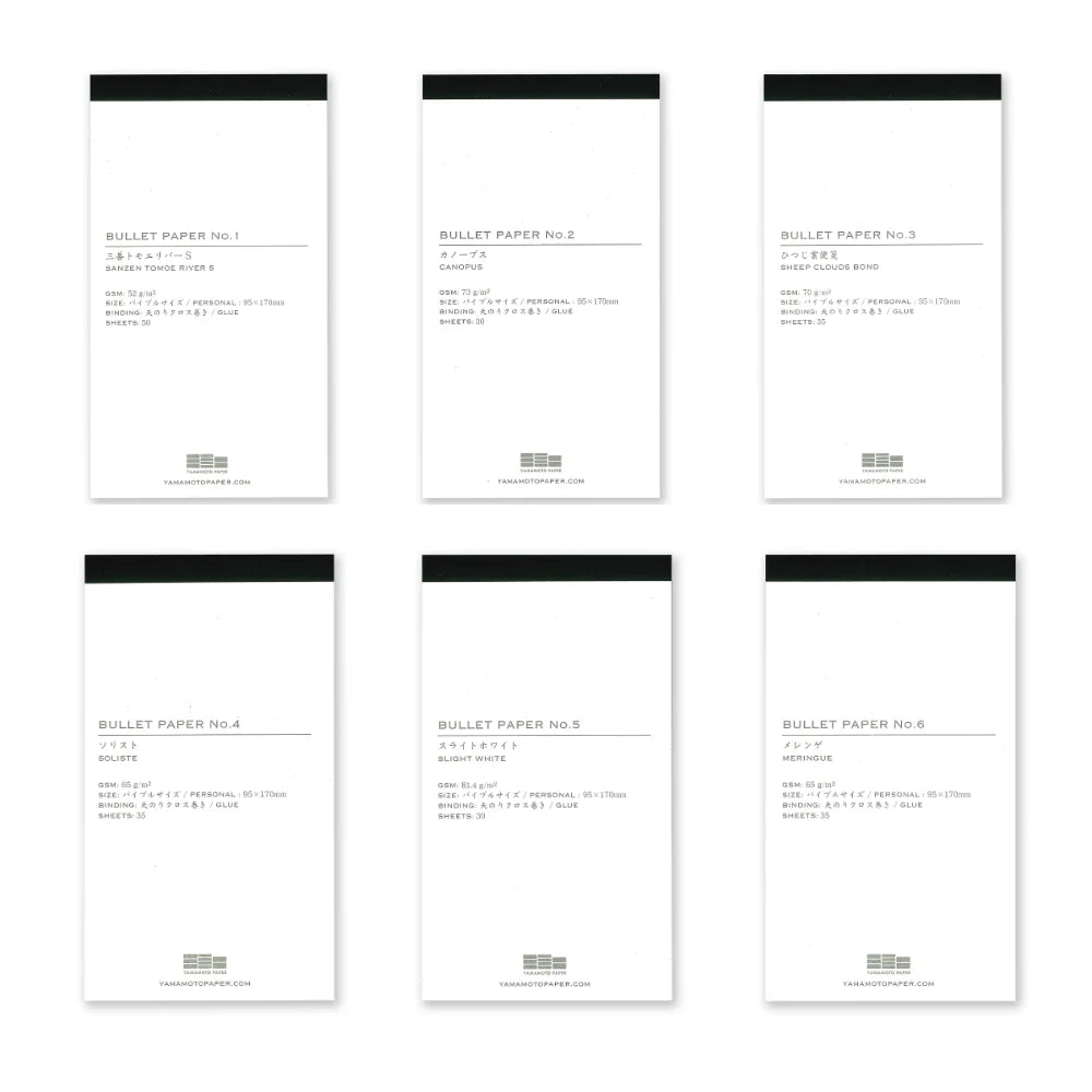 High quality paper pads for use with Yamamoto's Bullet Jotter covers, or use on their own. Sized perfectly for Bible planners such as the Plotter, (95mm×170mm), these sheets can be punched and stored with a flawless “Cinderella fit”. There are 6 premium Japanese papers to choose from, all work well with fountain pens