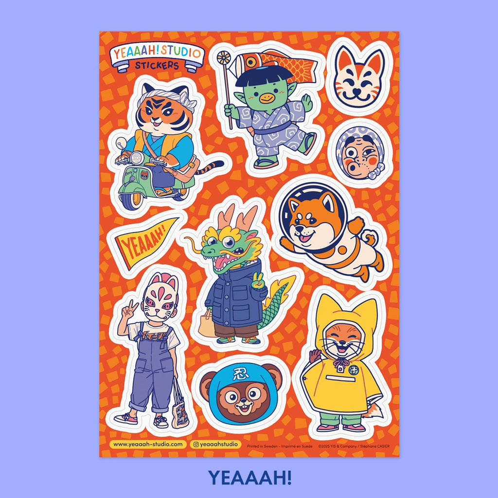 Between 9 and 15 stickers per sheet: • "Matsuri" sheet: 9 stickers • "Yeaaah" sheet: 10 stickers • "Japanese food" sheet: 11 stickers • Mimi & Lil’ Tako sheet: 15 stickera